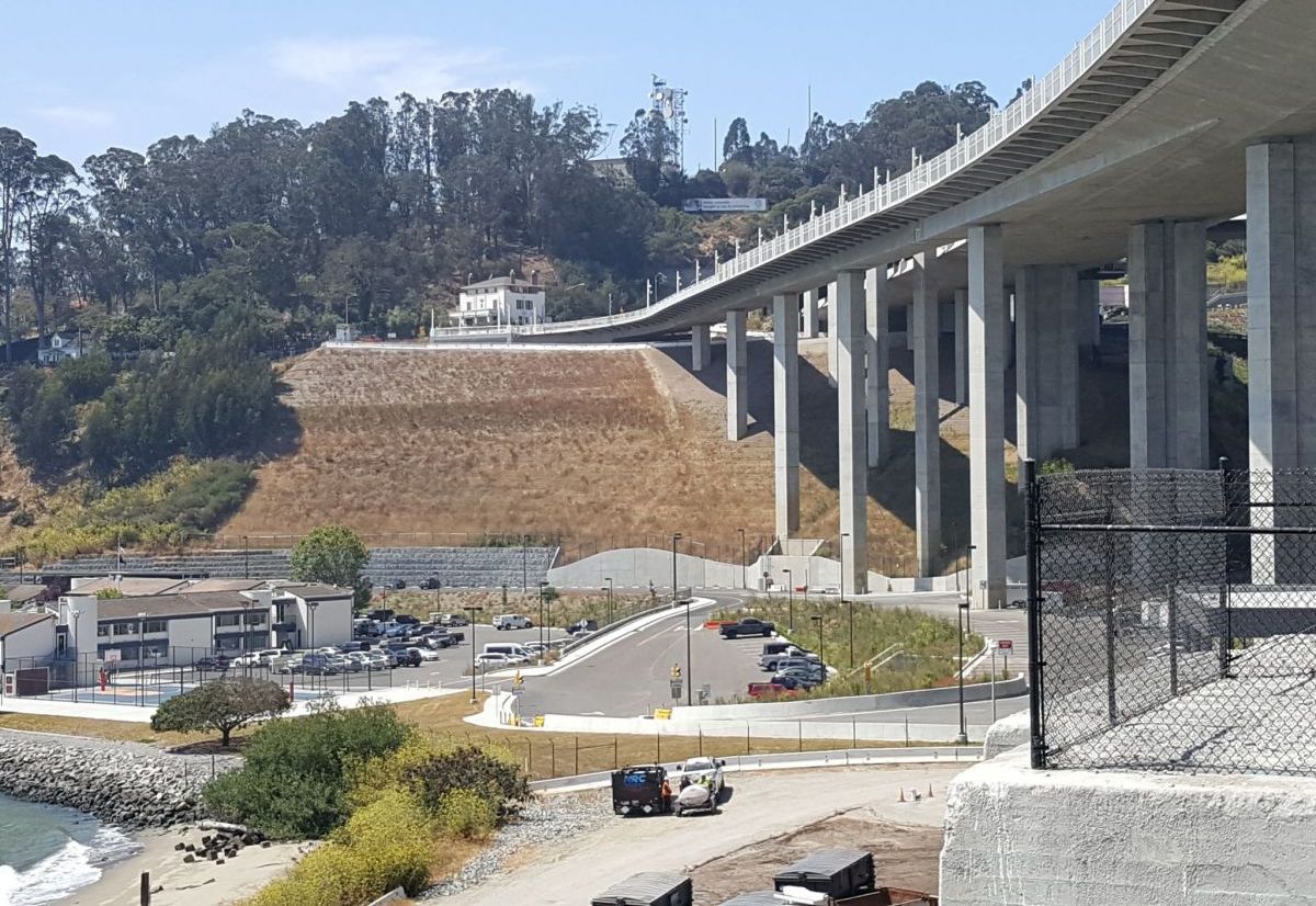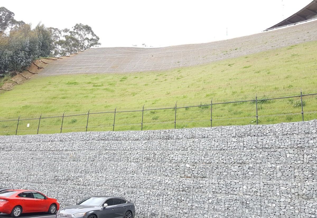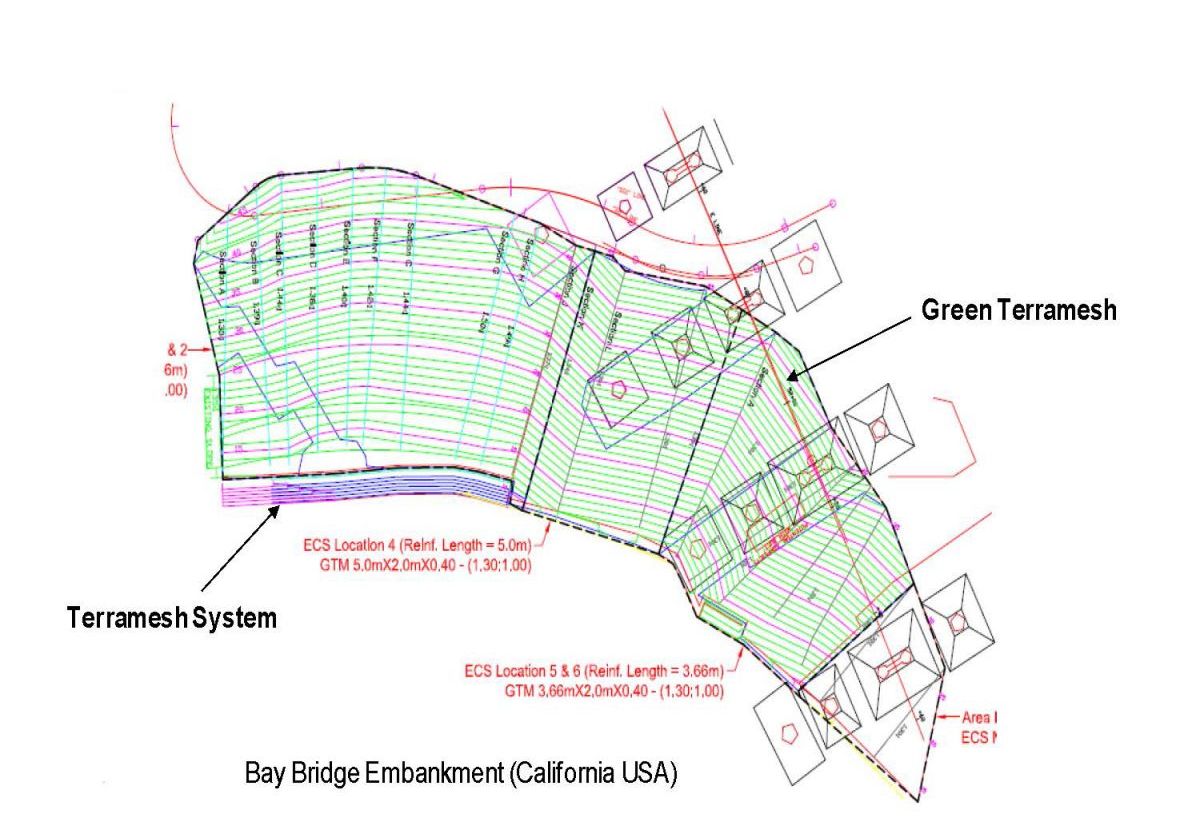 The Bay Bridge demolition and reconstruction required a reinforced soil slope in the final phases of the new bridge’s construction. A reinforced slope was urgently needed behind the U.S. Coast Guard building that sits at water level on the southeast coast of Yerba Buena Island. The embankment confinement system (ECS) facing alignment was originally proposed to follow contours.