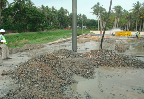 Reinforced Soil wall with concrete panels as facia and Paraweb as reinforcement was selected as the best solution in comparison to RS wall with steel strips. T-shaped panels with plain finish were mainly used as facia panels and bottom panels were half panels. Some special end panels and corner panels were also used. The connection between the panels & facia was done by galvanized toggles and loops. PVC dowels were used to connect different types of panels. One side of the approach ramp had a curvature of radius 35m which put forward a great challenge in front of the designers & construction team. Additionally, the width of ramp was less than the length of reinforcing strip- ParaWeb required by design. ParaWeb strips of either side of walls were connected to each other. Initially, a proposal for soil replacement was suggested to improve the bearing capacity of the foundation soil. However, due to high water table, replacement of soil could become a cumbersome and difficult process. Thus, keeping in mind the high water table and excessive consolidation settlements, such a ground improvement technique was to be proposed which would improve bearing capacity of soil, reduce post-construction settlement and also facilitate the process of implementation. Thus, considering all these factors, stone column technique with composite soil was proposed. The proposal got approved by IIT Chennai who also gave the approval for the design.