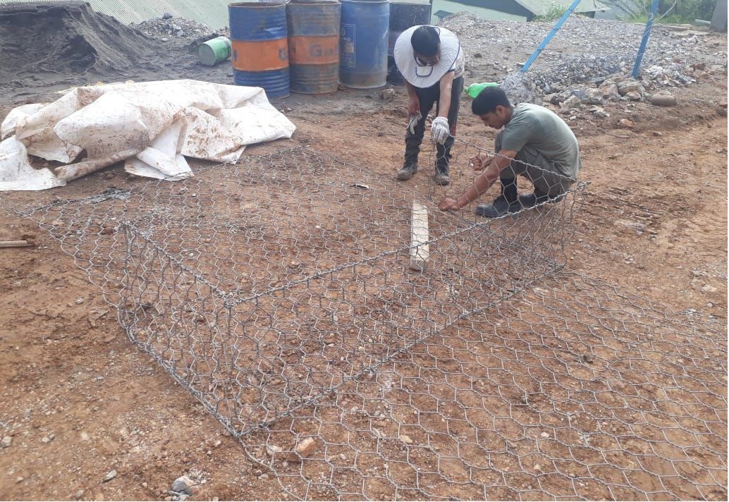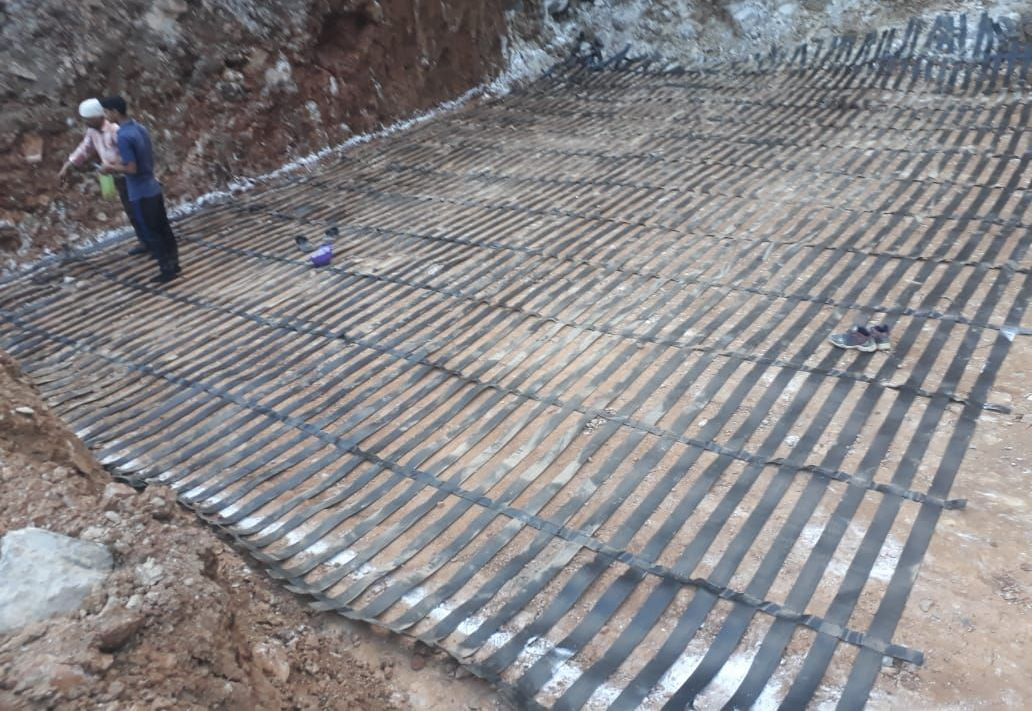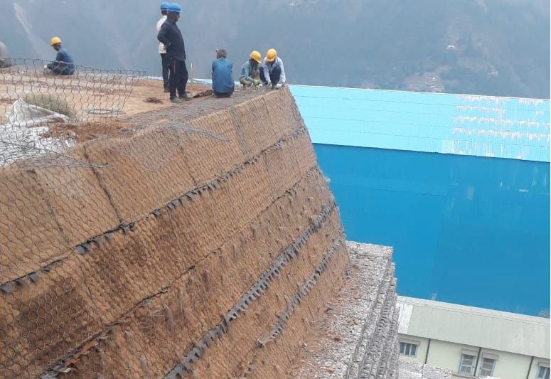 Based on the site conditions and specific requirements of the client, Terramesh units made of gabion fascia along with an integrated tail as reinforcement of length 2m which is made of mechanically woven, double twisted, hexagonal shaped steel wire mesh was used. On the upper reaches of the structure, Green Terramesh units consisting of double twisted hexagonal shaped steel woven wire mesh along with a biodegradable erosion control blanket and a welded mesh panel with three steel tie rods were installed. For composite soil reinforcement system on which cranes could work, high strength flexible geogrids made of polyester core with polyethylene coating, ParaLink were installed as a primary reinforcement. Drainage composite, MacDrain W was used for drainage purposes between two different fills. Polyester needle punched non woven geotextile, MacTex was used as a filter media behind gabion facia units and wrapped around PVC pipe which allowed free movement of water and prevented backfill soil from entering in the voids between stone filling. Further, continuous threaded anchors of min. 3m length were embedded into the rock strata. Paralink was connected with anchors.