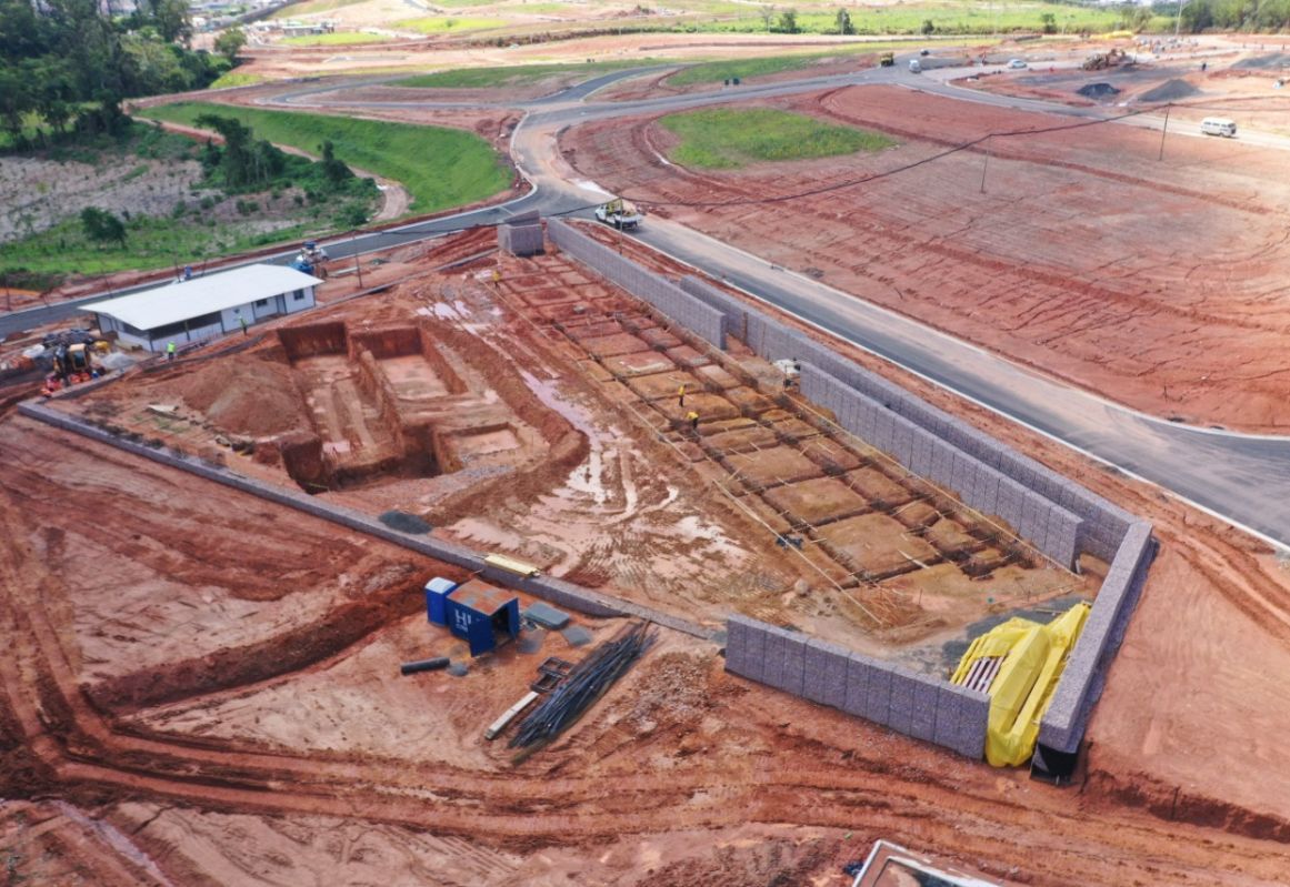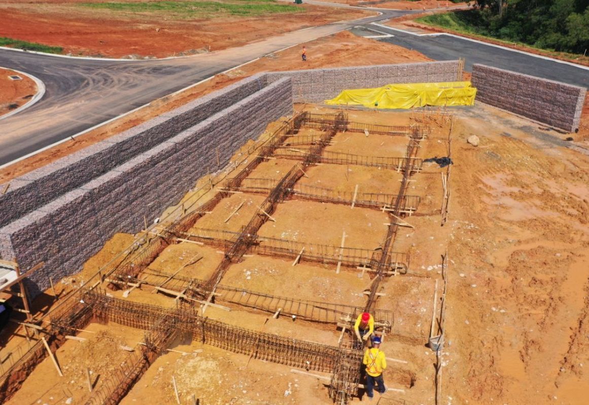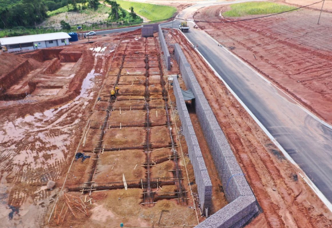 The retaining walls were designed using a gravity gabion retaining system. The architectural boundary walls were defined with a maximum thickness of 50 cm. To stabilise the architectural walls with gabions, it was necessary to use an internal metal structure that guarantees their stability, while the hexagonal mesh gabions enclose the filling material and provide the finish idealised by the architect. In all, the architectural walls will have a face area of more than 500,00 m².
