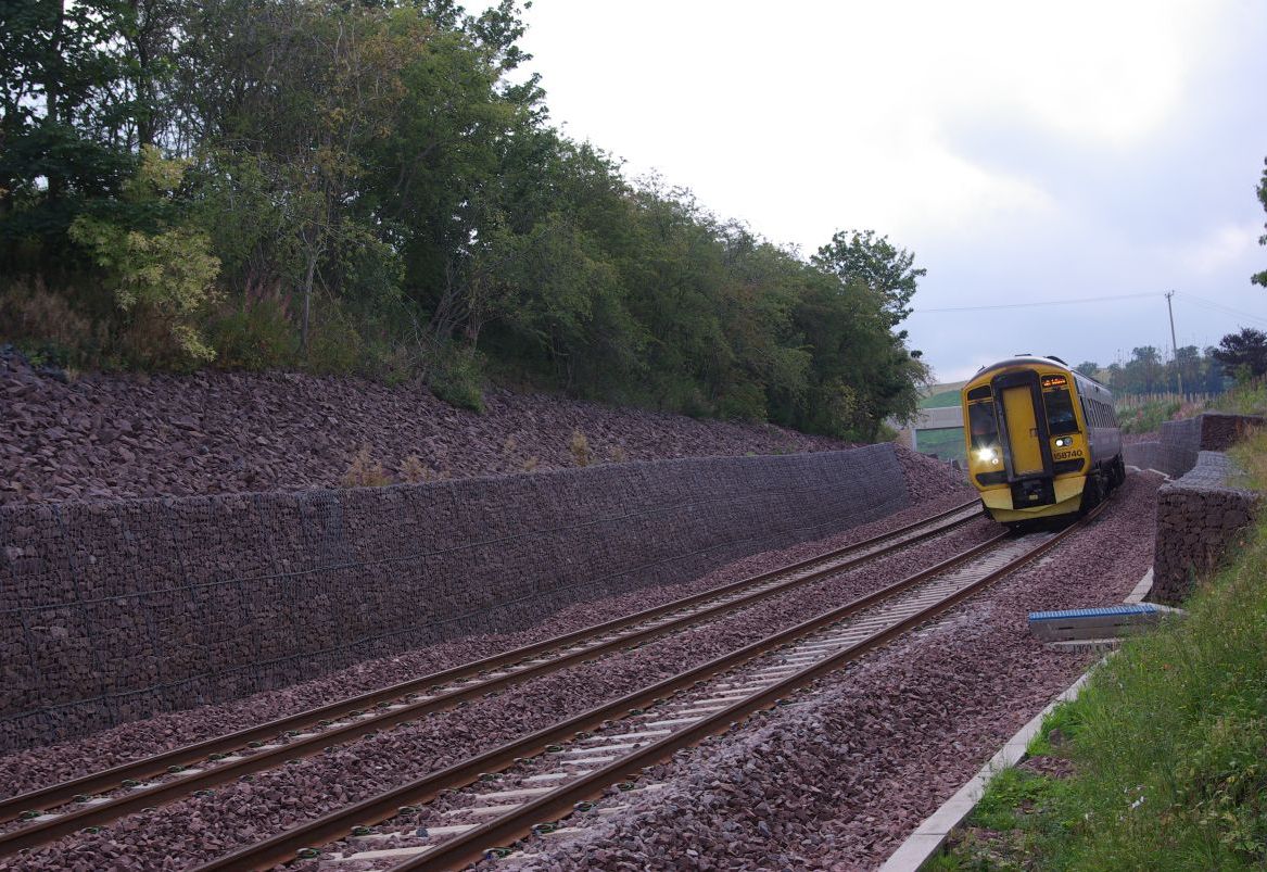 Our woven double-twist polymer-coated gabion units have proven to be an effective choice in infrastructure works due to their robustness, long life and ability to accommodate differential settlement. These attributes are particularly important when next to railway lines when exposed to regular vibrations. Our gabions are manufactured from steel wire with a zinc-aluminium heavy-duty galvanising and an additional polymer coating. The gabions are BBA Certified with a design life of up to 120 years. The gabions were filled with locally sourced stone and hand packed at the front face to provide a high-quality attractive dry-stone wall-type finish.