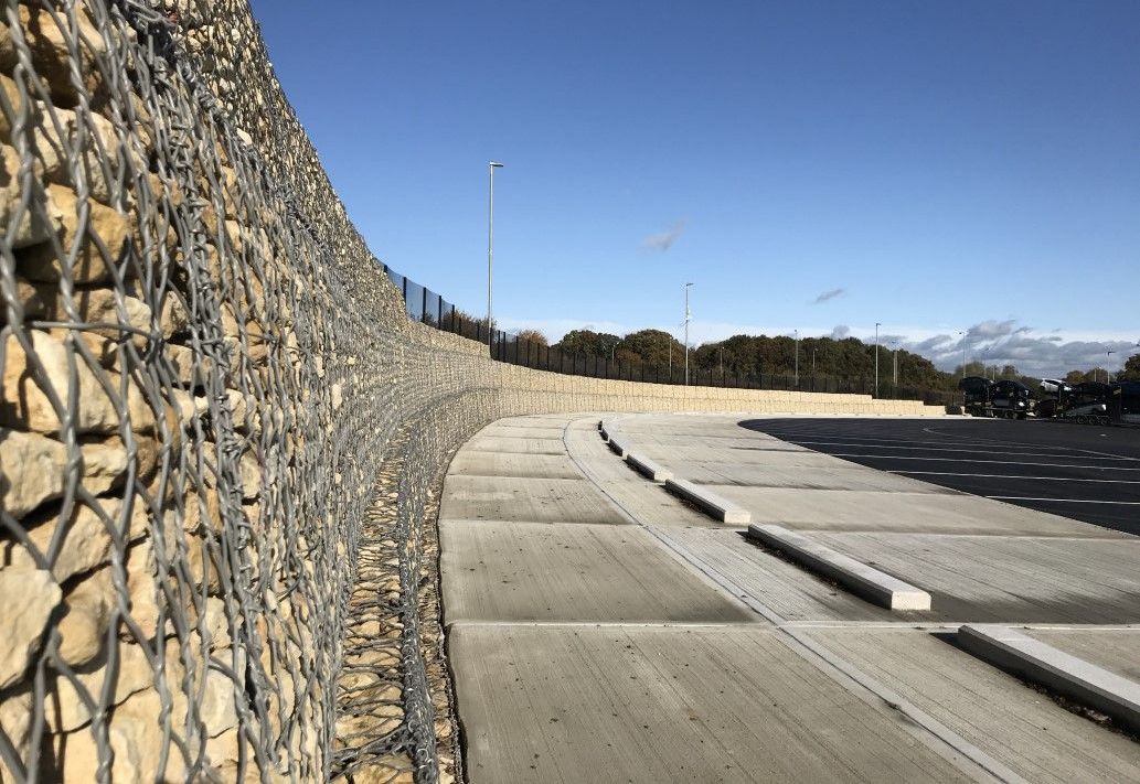 The proposal was to increase the HVG parking numbers by  79 new spaces, to the west of the petrol filling station. The   proposal sits into the ground meaning there would be the   need for retaining walls around the circumference of the   site. To aid functionality and reduce its visual impact, gabion   retaining walls were used. Tree planting and earth modelling   will also help set the scheme into the landscape.