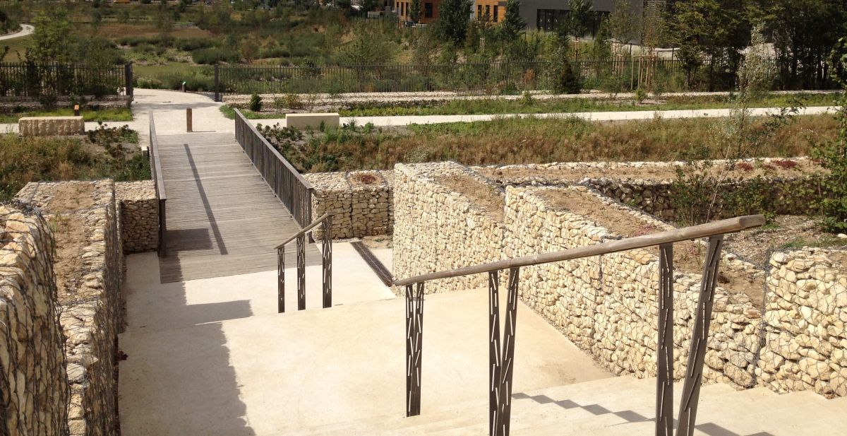 The combination of the cages and the infill material resulted in a structure that blends in perfectly with the landscape of the Parc des Chanteraines, including a 4.50 m high weight-bearing wall with a 1 m railing and the integration of a metal footbridge.